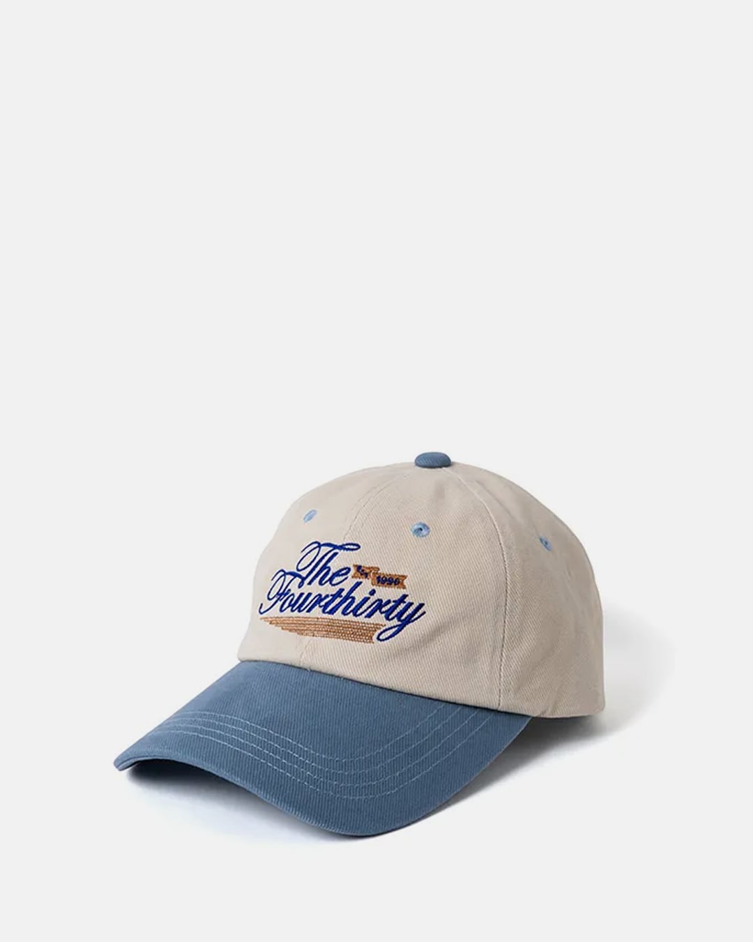 バイカラーがレトロなスポーティーさを醸し出すロングビルキャップです。 ラベルのようなデザインを刺繍でポップさも表現しています。